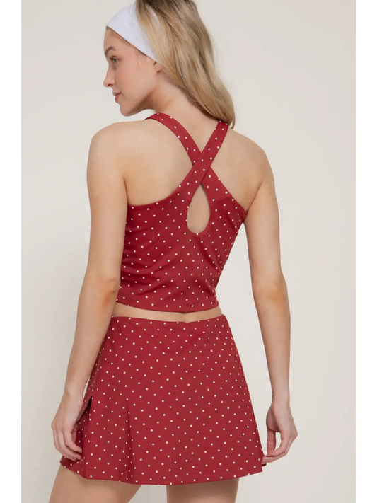 Strappy Back Tank Top & Wrap Skort Dot Print Activewear Set - Red