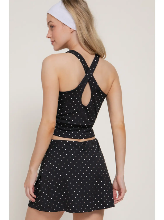 Strappy Back Tank Top & Wrap Skort Dot Print Activewear Set - Black