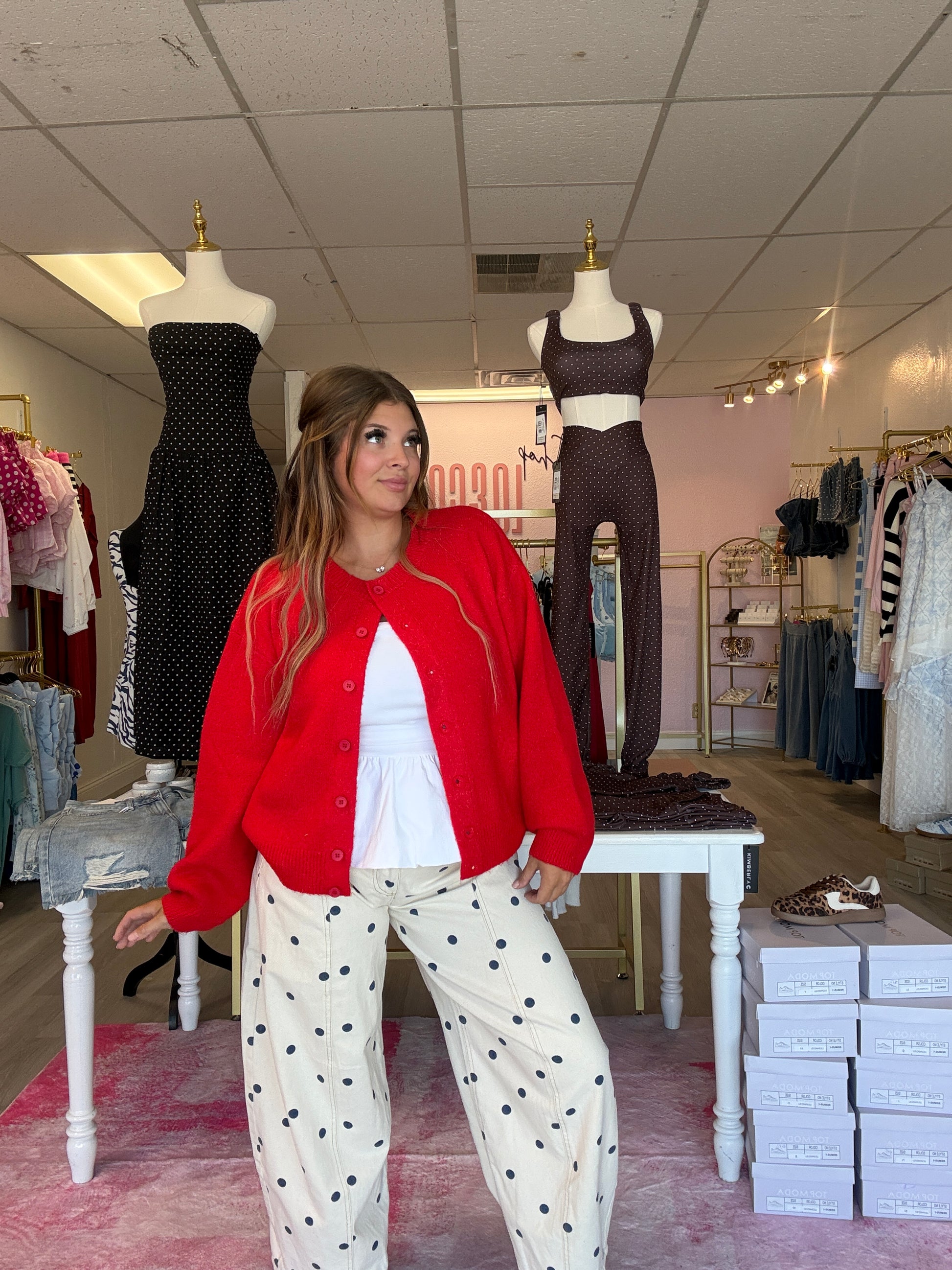 Knit button-up cardigan sweater. 74% ACRYLIC 22% POLYESTER 4% SPANDEX HPS: S: 20 1/2 M: 21" L: 21 1/2"