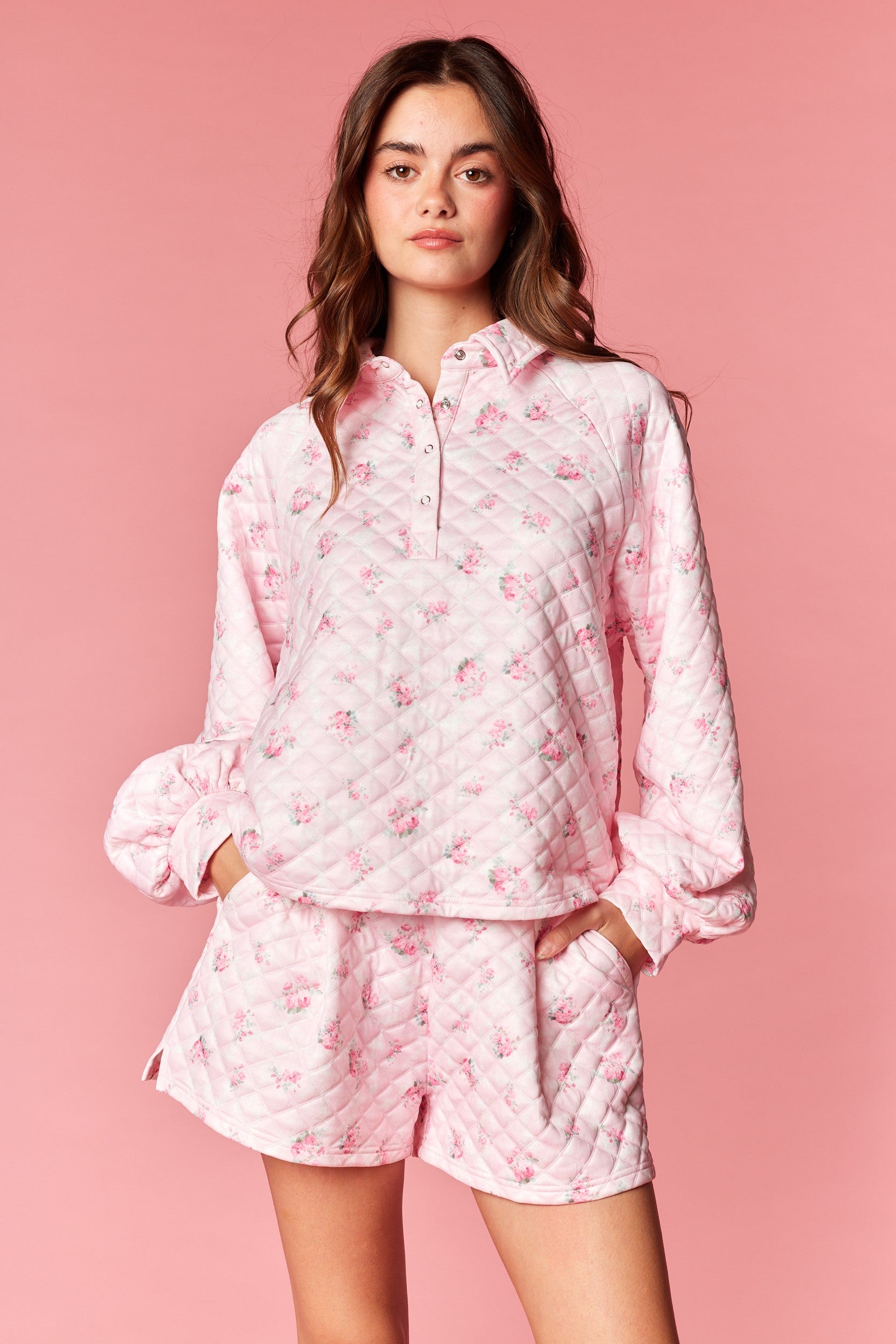 Two-piece lounge set featuring a soft quilted fabric with delicate all-over floral print for a cozy, feminine look - Long sleeve pullover top designed with a snap-button half placket and subtle ruffle trim at the neckline for a romantic touch - Lightly padded quilted texture provides warmth while remaining lightweight and comfortable for everyday wear - Matching shorts designed with a clean waistband and relaxed fit for easy movement and all-day comfort - Diamond quilt stitching adds dimension and a polished finish to the overall silhouette